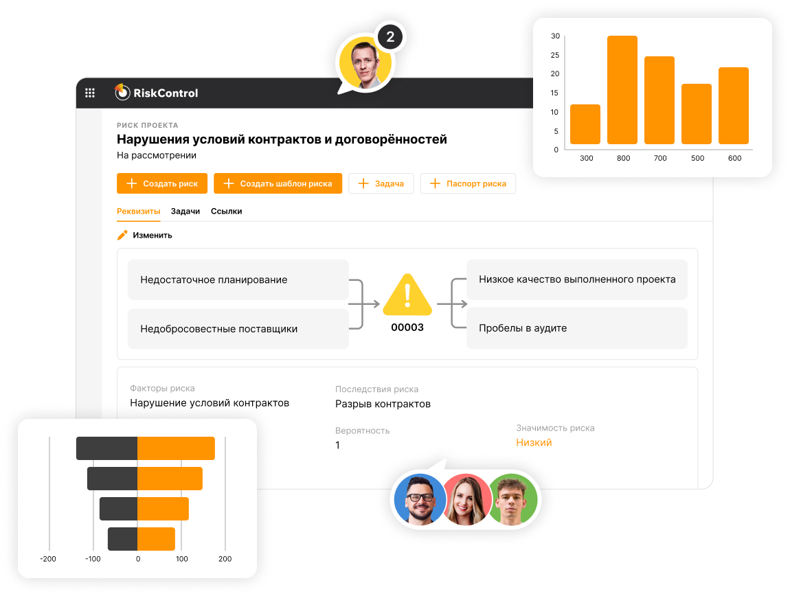С RiskControl процессы управления рисками станут более прозрачными и понятными за счёт организованного взаимодействия участников процесса, контроля соблюдения методологии и принятия обоснованных решений.